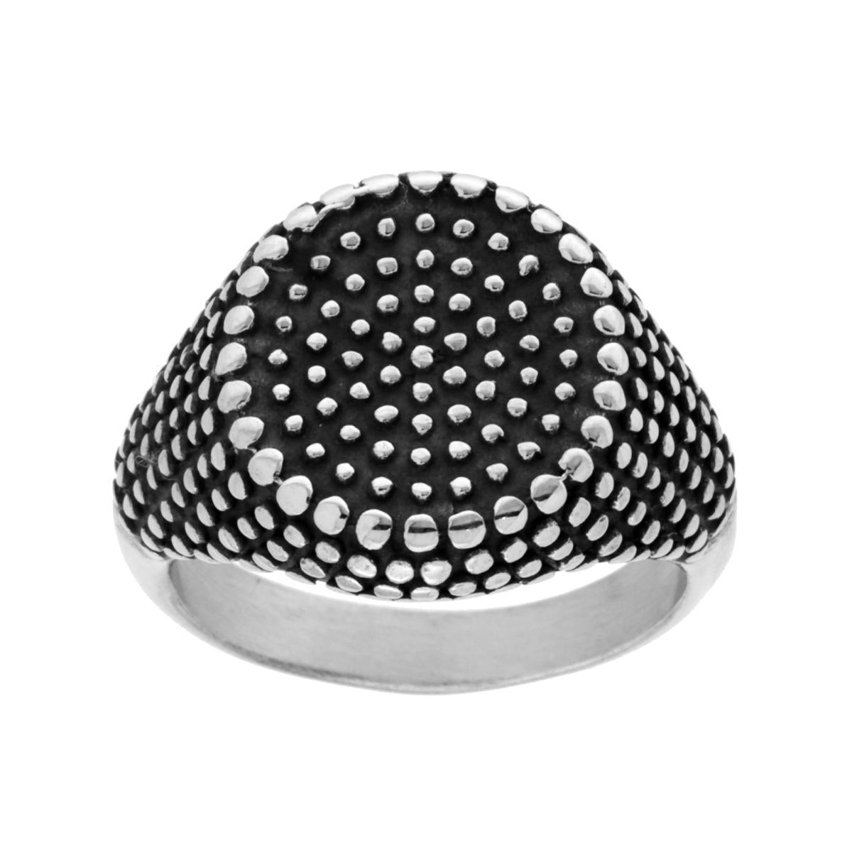 Anello chevalier con scudo di forma tonda con decoro pallinato, finitura lucida e brunita.