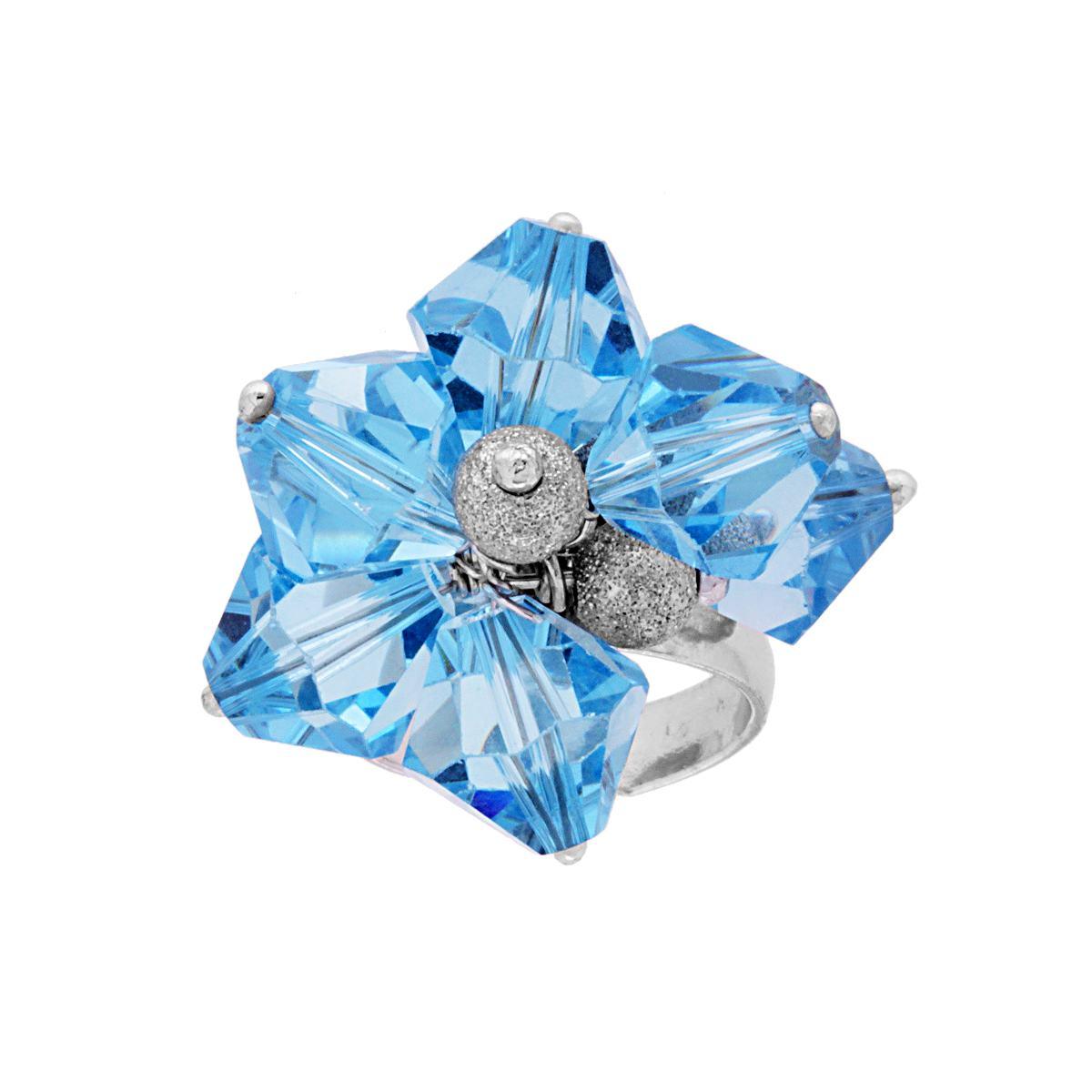 Anello open con accessori pendenti a forma di prisma in Crystal colore azzurro e palline con finitura diamantata.