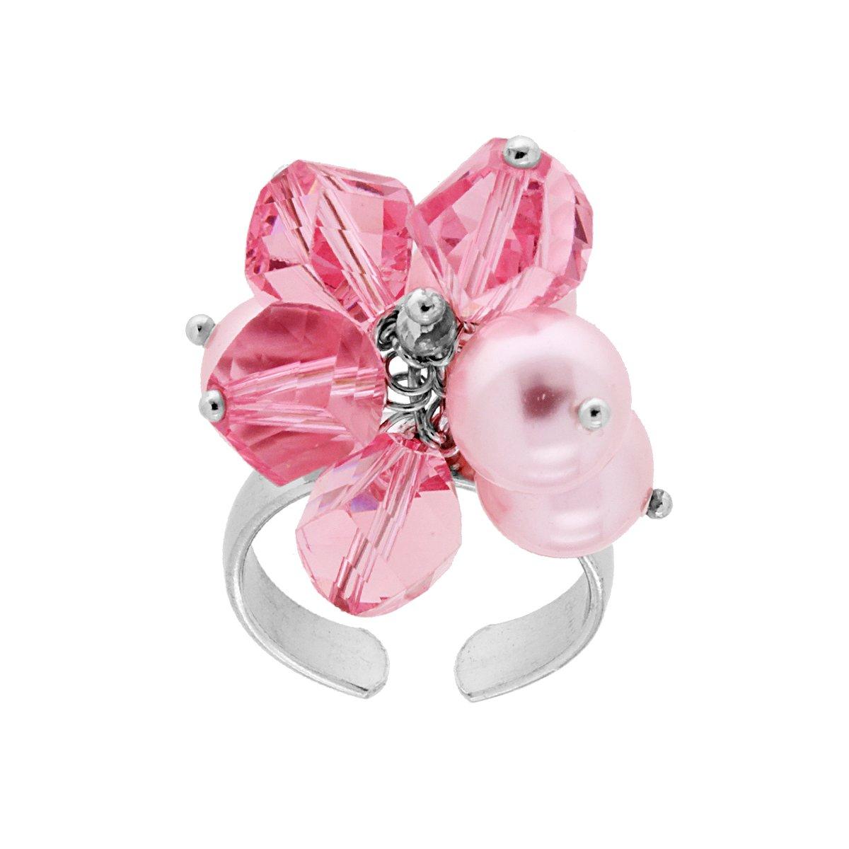 Anello open con accessori pendenti a forma di prisma in Crystal colore rosa e perle rosa in vetro perlato.