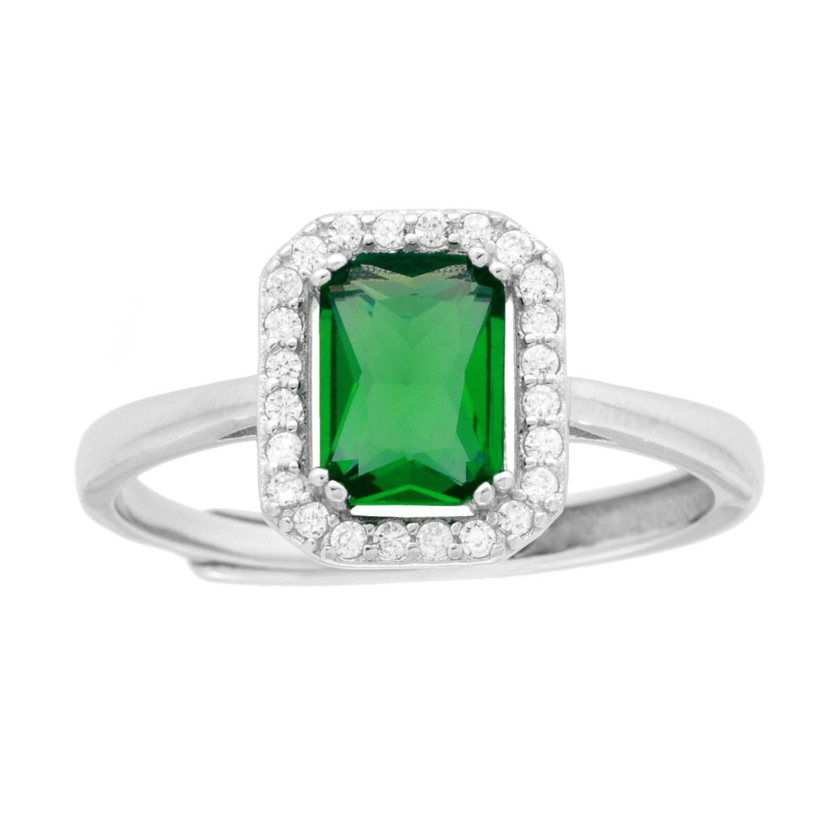 Anello Solitario Rettangolare Cubic Zirconia Verde Smeraldo contornato da Cubic Zirconia Bianchi in ARGENTO 925 Galvanica Rodio