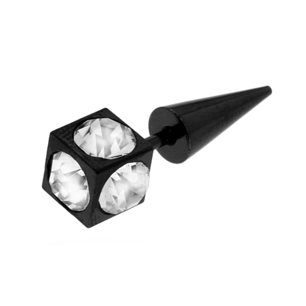 Body Piercing barra con fake expander colore nero con cubo con Crystal bianchi incastonati e chiusura con cono con finitura liscia e lucida.