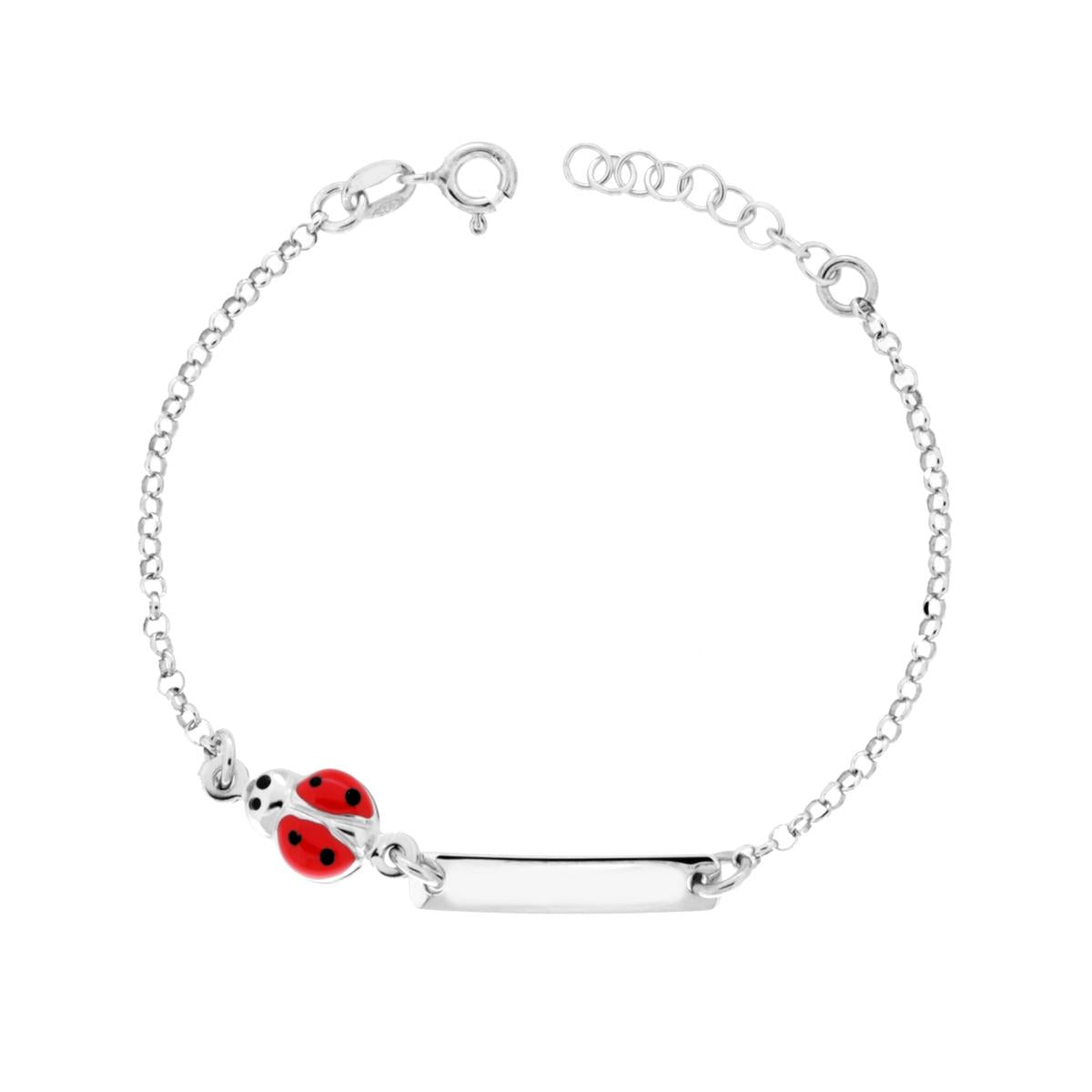 Bracciale Bimba Bimbo con Catena Rolo Diamantata Targa plain e Coccinella smalto Rosso in ARGENTO 925 Galvanica Rodio