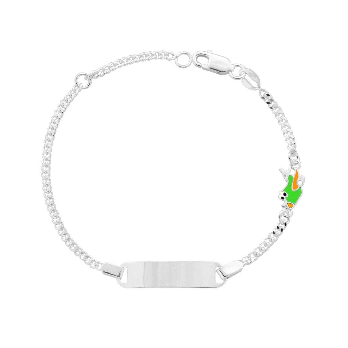 Bracciale Bimbo Bimba Catena Grumetta Diamantata con Targa Rettangolare e Aeroplano Smalto Arancione e Verde in ARGENTO 925