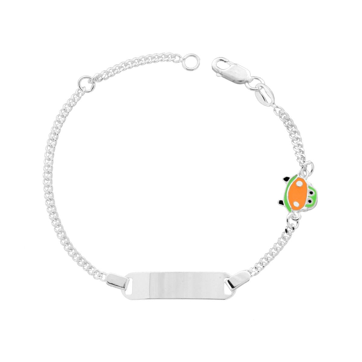 Bracciale Bimbo Bimba Catena Grumetta Diamantata con Targa Rettangolare e Automobile Smalto Arancione e Verde in ARGENTO 925