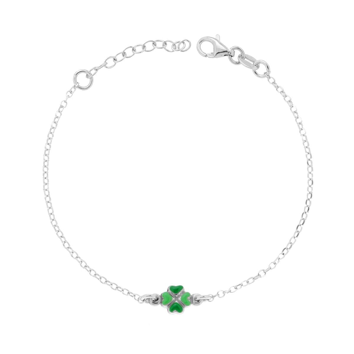 Bracciale Bimbo Bimba Catena Rolo con Quadrifoglio smalto Verde in ARGENTO 925 Galvanica Rodio