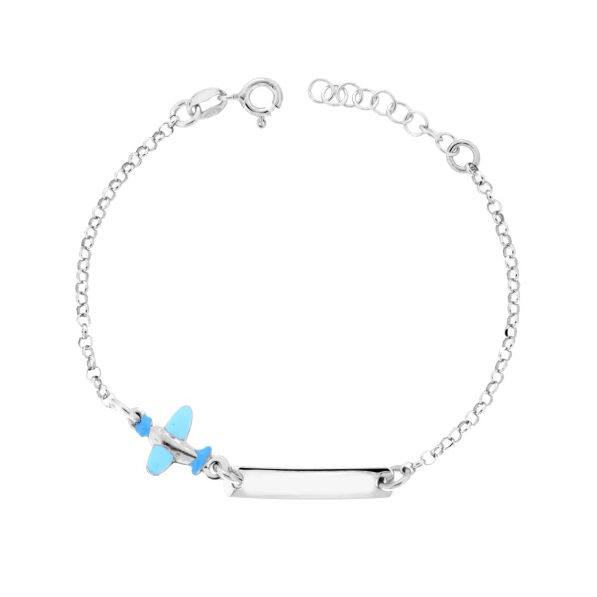 Bracciale Bimbo Bimba Catena Rolo con Targa Rettangolare e Aeroplano Smalto Azzurro in ARGENTO 925 Galvanica Rodio