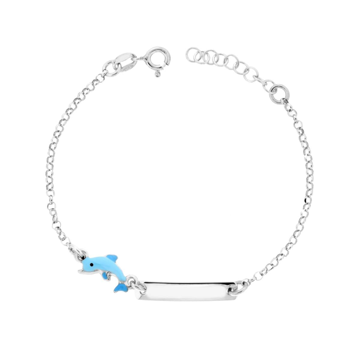 Bracciale Bimbo Bimba Catena Rolo Diamantata con Targa Rettangolare e Delfino smalto Azzurro in ARGENTO 925 Galvanica Rodio