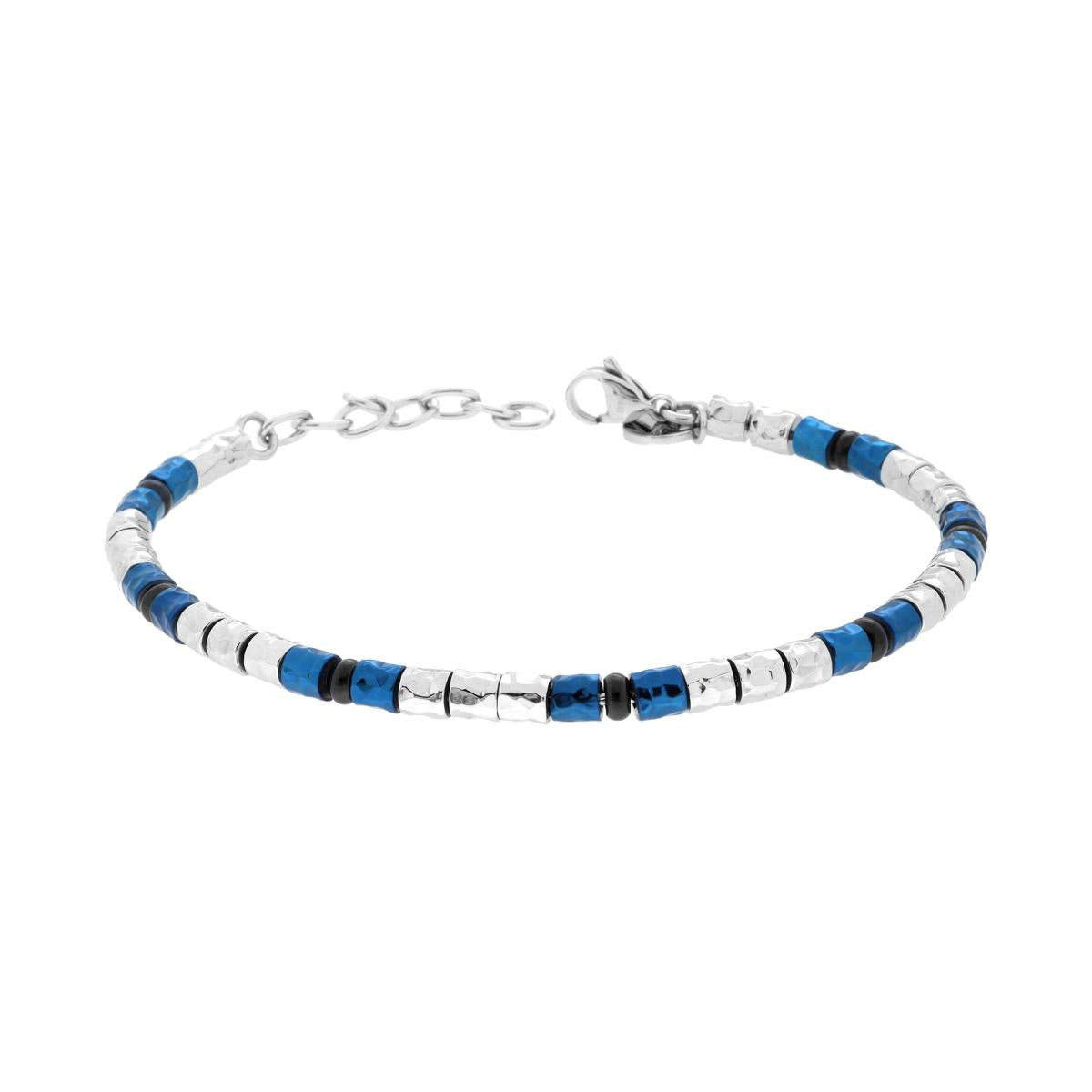 Bracciale catena con cilindri colore blu e acciaio con finitura martellata e lucida alternati ad anelli colore nero.