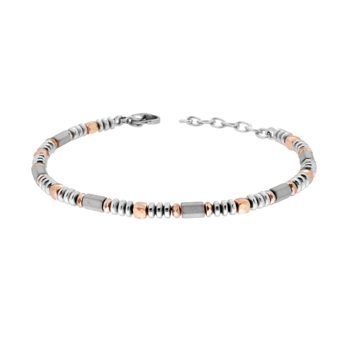 Bracciale catena con Cubetti e anelli colore rosè con finitura sfaccettata e cilindretti bullonati colore grigio satinati, alternati ad anelli lisci e lucidi.