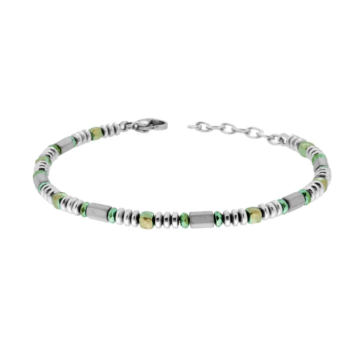 Bracciale Catena con Cubetti e Anelli Sfaccettati Verde e Cilindri Grigi in ACCIAIO