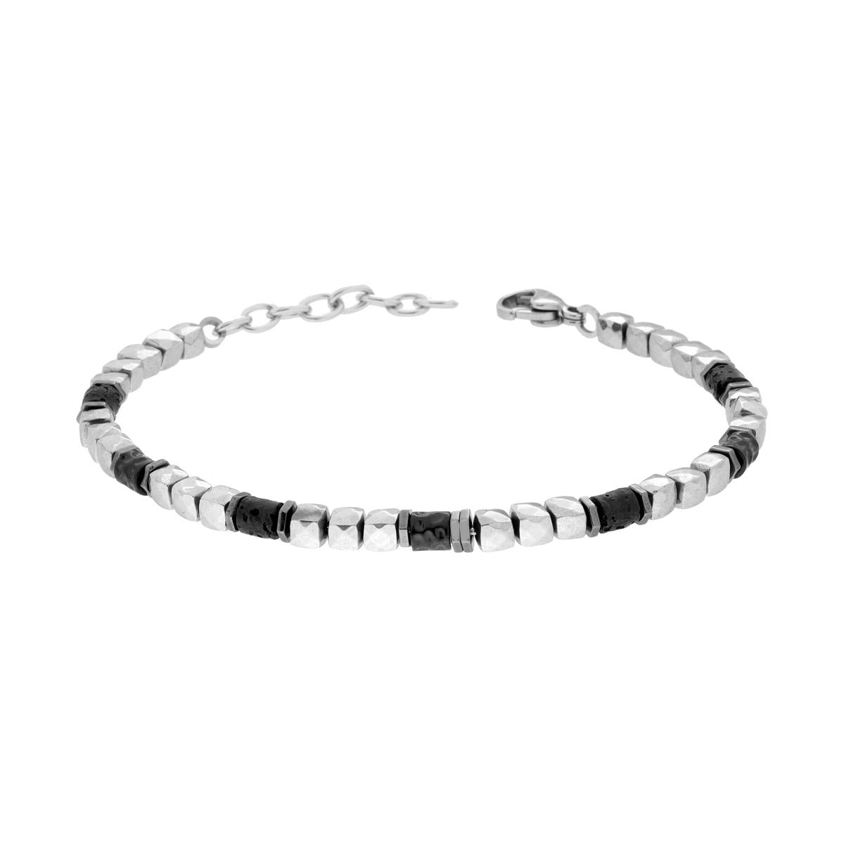 Bracciale con cilindri in pietra lavica alternati a cilindri martellati, cubetti sfaccettati e bulloncini con finituta lucida.