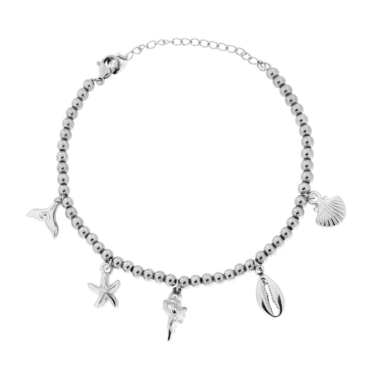 Bracciale catena con palline e accessori pendenti a forma di conchiglie, stella marina e coda di balena con finitura liscia e lucida.