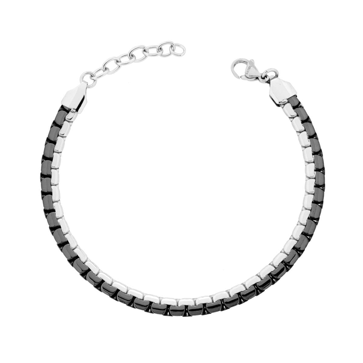 Bracciale con catena veneziana tonda piatta, colore acciaio e nero, con finitura liscia e lucida.