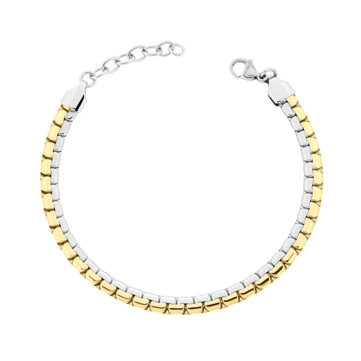 Bracciale con catena veneziana tonda piatta, colore acciaio e oro, con finitura liscia e lucida.