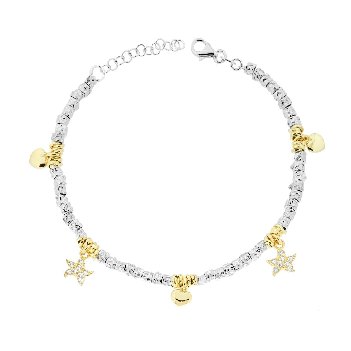 Bracciale Cubetti Martellati con Charms Cuori e Stella Marina con Cubic Zirconia Bianchi in ARGENTO 925 Galvanica Rodio e Oro