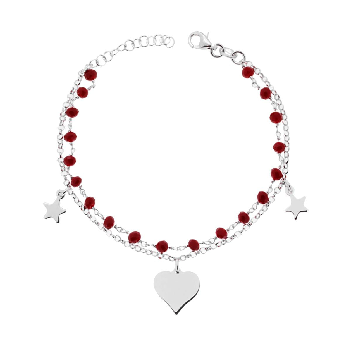 Bracciale due fili Catena Crystal Rosso e Catena Rolo Diamantata con Cuore e Stelle plain pendenti in ARGENTO 925 Galvanica Rodio