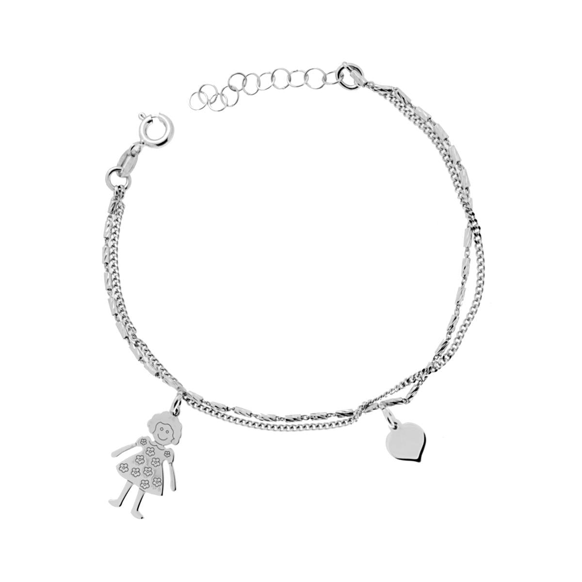 Bracciale composto da due fili, uno catena grumetta e uno catena di cilindretti diamantati, con acccessori pendenti plain a forma di cuore e di bimba, lucidi.