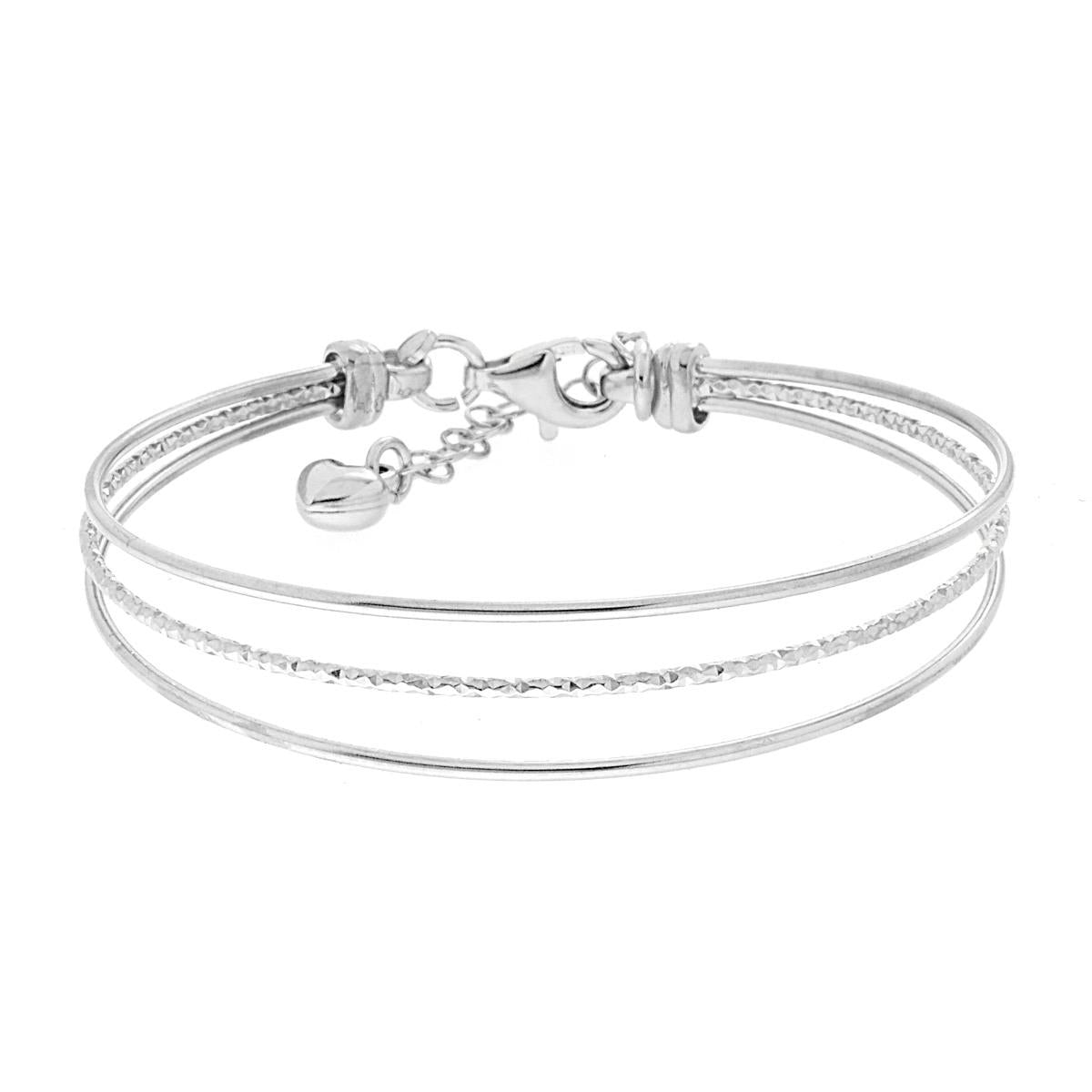 Bracciale rigido con tre fili con finitura diamantata e lucida, cuoricino bombato e pendente su chiusura.