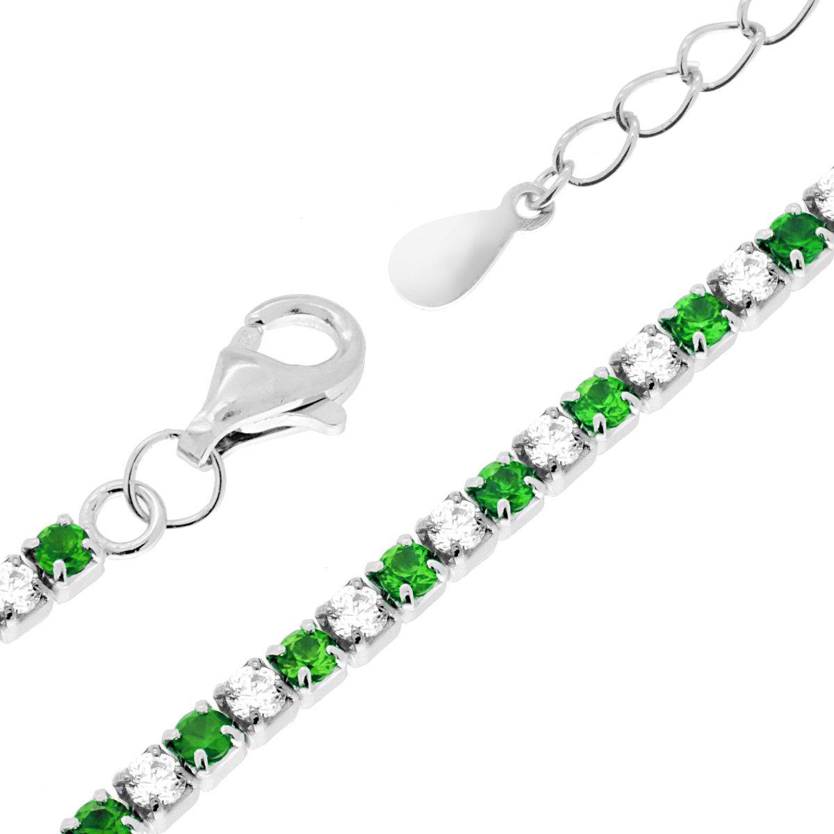 Bracciale Tennis Griffe cm 17+3 con Zirconi mm 2 Bianchi e Verde Smeraldo alternati in ARGENTO 925 Galvanica Rodio