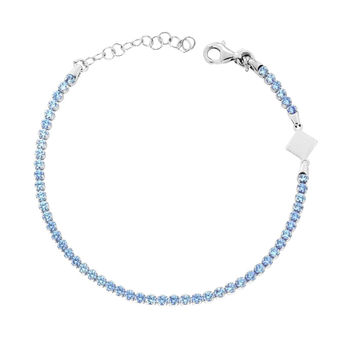Bracciale Tennis con cubic zirconia acquamarina montati su 4 Griffe, con accessorio piastrina di forma quadrata liscia e lucida.