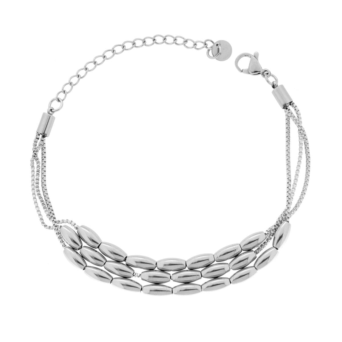 Bracciale con tre fili catena veneziana con accessori passanti di forma ovale con finitura liscia e lucida.