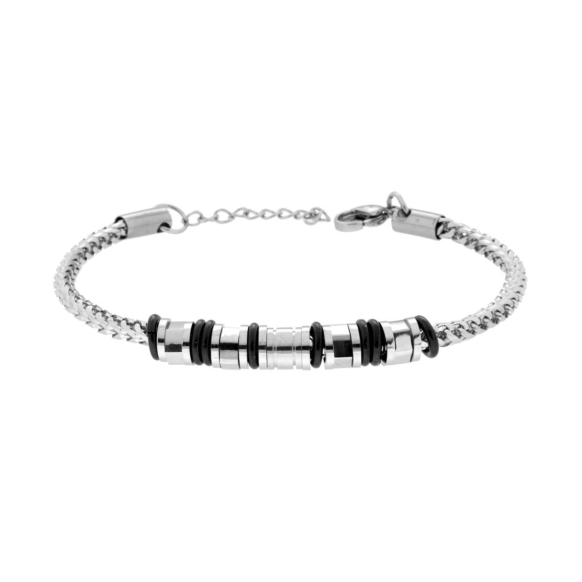Bracciale con catena con maglia Franco Tonda con accessori centrali a cilindo e bullone alternati ad anelli neri con finitura liscia e lucida.