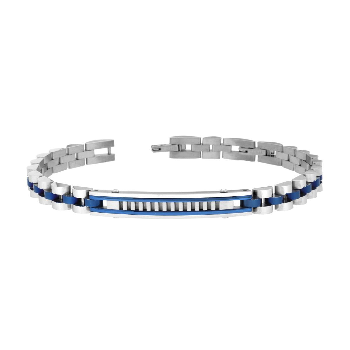 Bracciale Uomo Catena Imperniata Blu con Targa con Inserto Dentellato Satinato in ACCIAIO