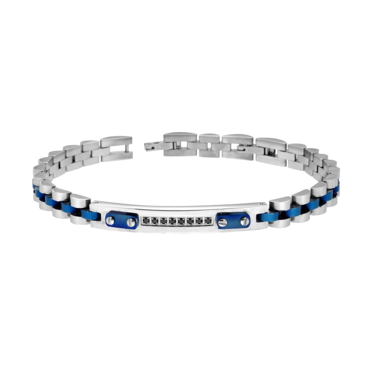 Bracciale Uomo Catena Imperniata colore Blu con Targa e Crystal Neri in ACCIAIO