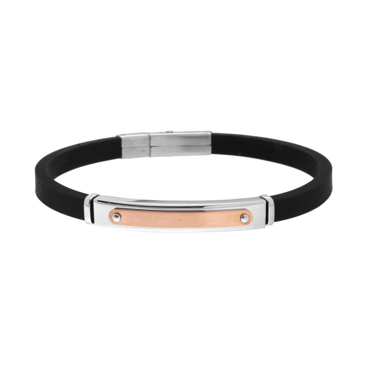 Bracciale in PVC Caucci colore nero con Targa centrale con piastra applicata colore rosè satinata.