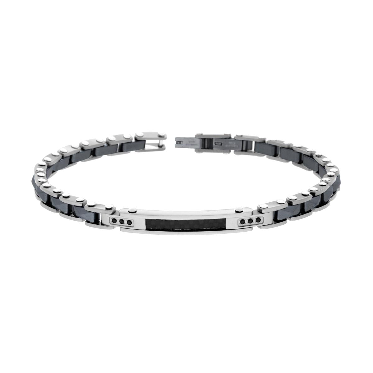 Bracciale con maglia imperniata e Targa con crystal neri incastonati, elementi in ceramica con forma bugnata colore antracite, inserto effetto fibra di carbonio e finitura liscia e lucida.