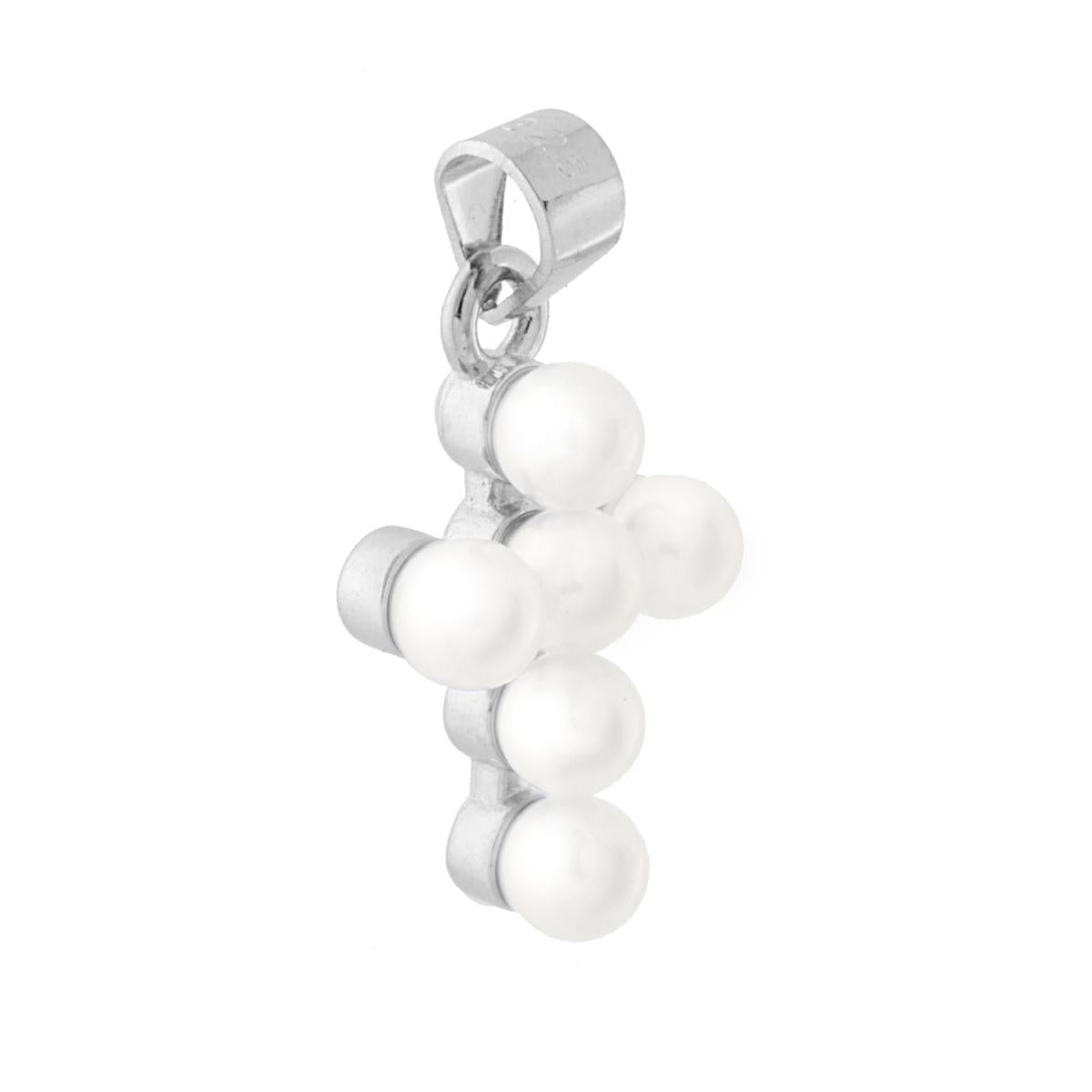 Ciondolo a forma di croce con perle bianche in vetro perlato.