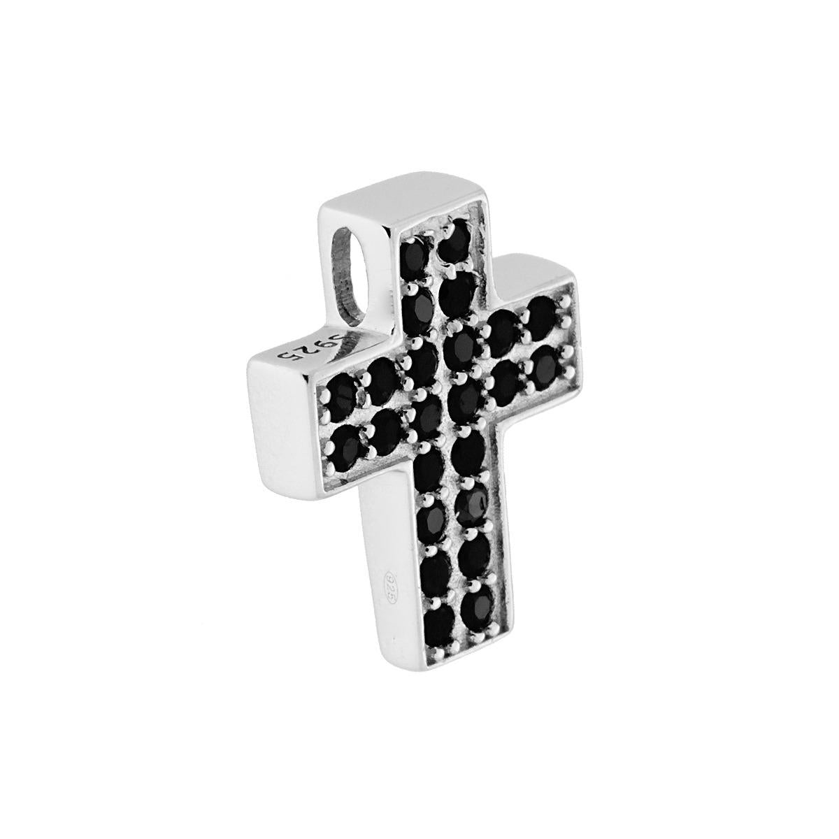 Ciondolo Croce Latina con Zirconi Neri in ARGENTO 925 Galvanica Rodio