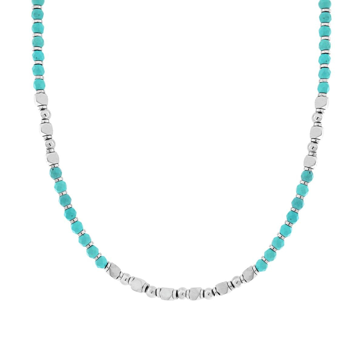 Collana con palline in pietra sfaccettata colore Turchese alternate ad anelli e cubetti in acciaio, con finitura liscia e lucida.