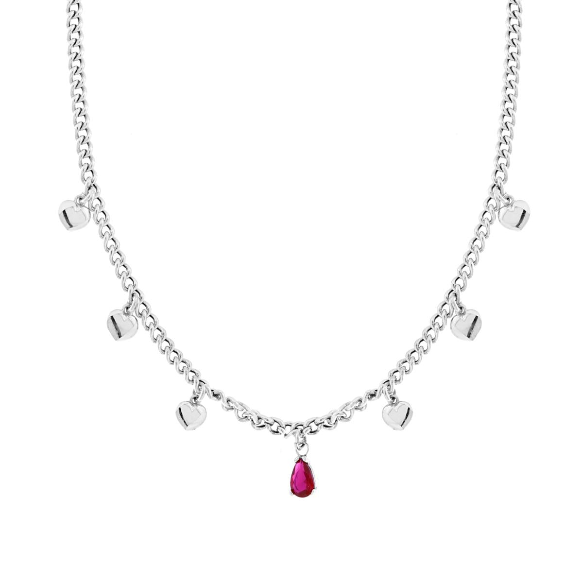 Collana con catena grumetta liscia e lucida con accessori pendenti a forma di cuore bombato e goccia cubic zirconia colore rosso rubino.