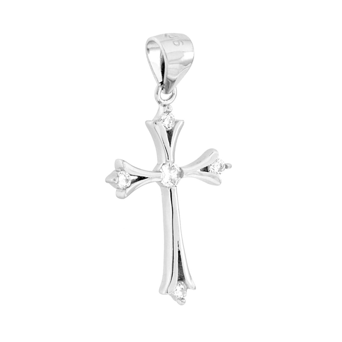 Ciondolo a forma di croce con finitura lucida e con cubic zirconia colore bianco incastonati.