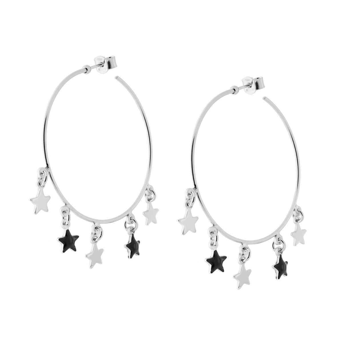 Orecchini a forma di Cerchio, modello Creola, con Accessori pendenti a forma di Stella con applicazione smalto colore nero e Rodiate.