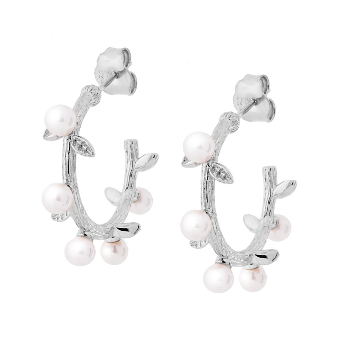 Orecchini Cerchio mm 25 con effetto ramo con Foglie e Perle Bianche in ARGENTO 925 Galvanica Rodio