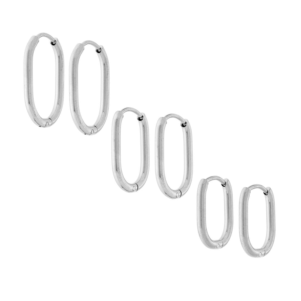 Tre coppie in tre misure di orecchini cerchio ovale con canna tubolare e finitura liscia e lucida.
