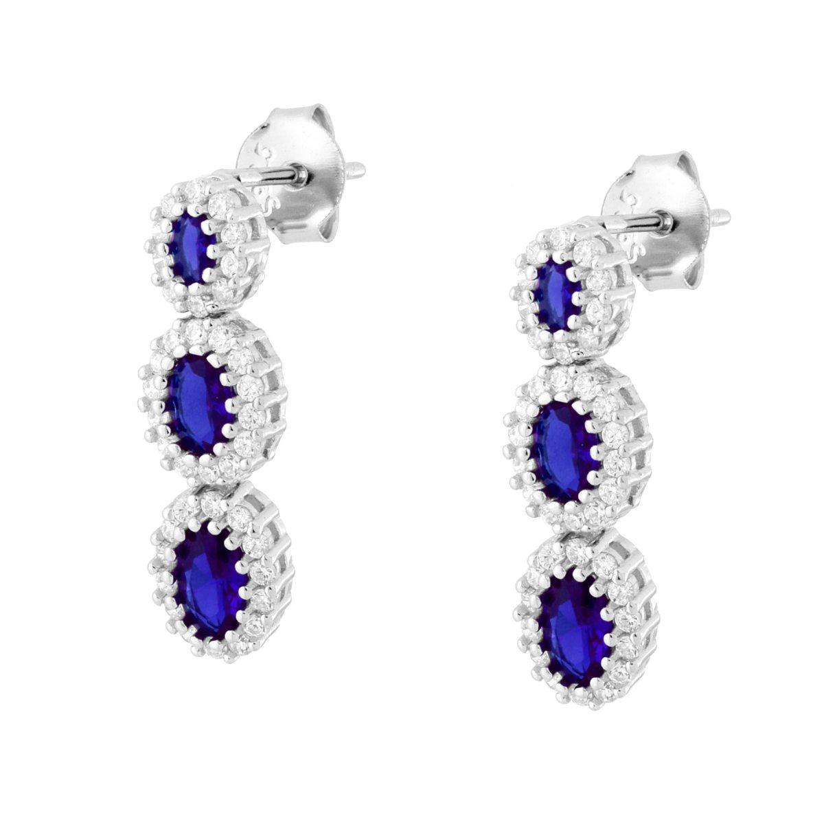 Orecchini composto da tre ovali pendenti con Blu Zaffiro e cubic zirconia bianchi incastonati intorno.