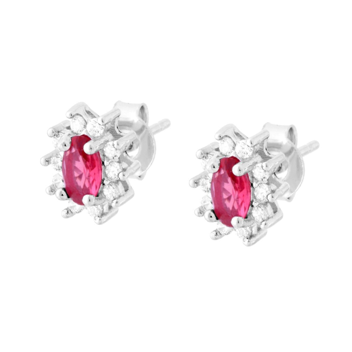 Orecchini con Zircone Ovale Rosso Rubino contornato con Zirconi Bianchi in ARGENTO 925 Galvanica Rodio