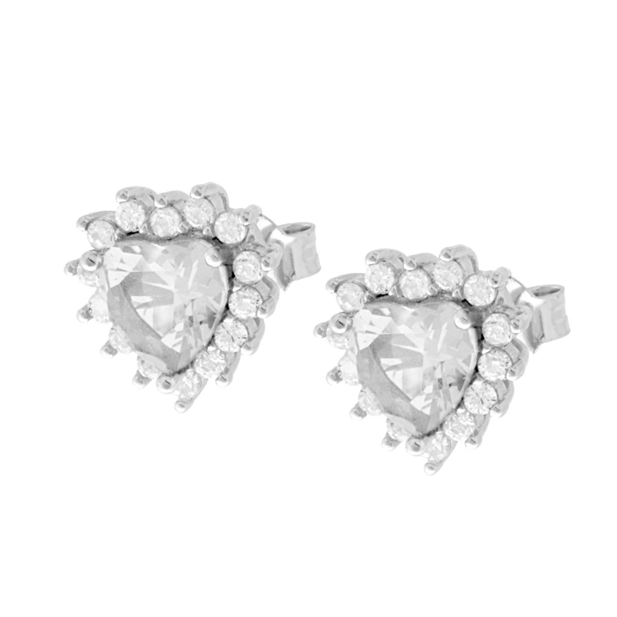 Orecchini a forma di Cuore con zircone bianco montato su 3 Griffe, contornato da zirconi bianchi.