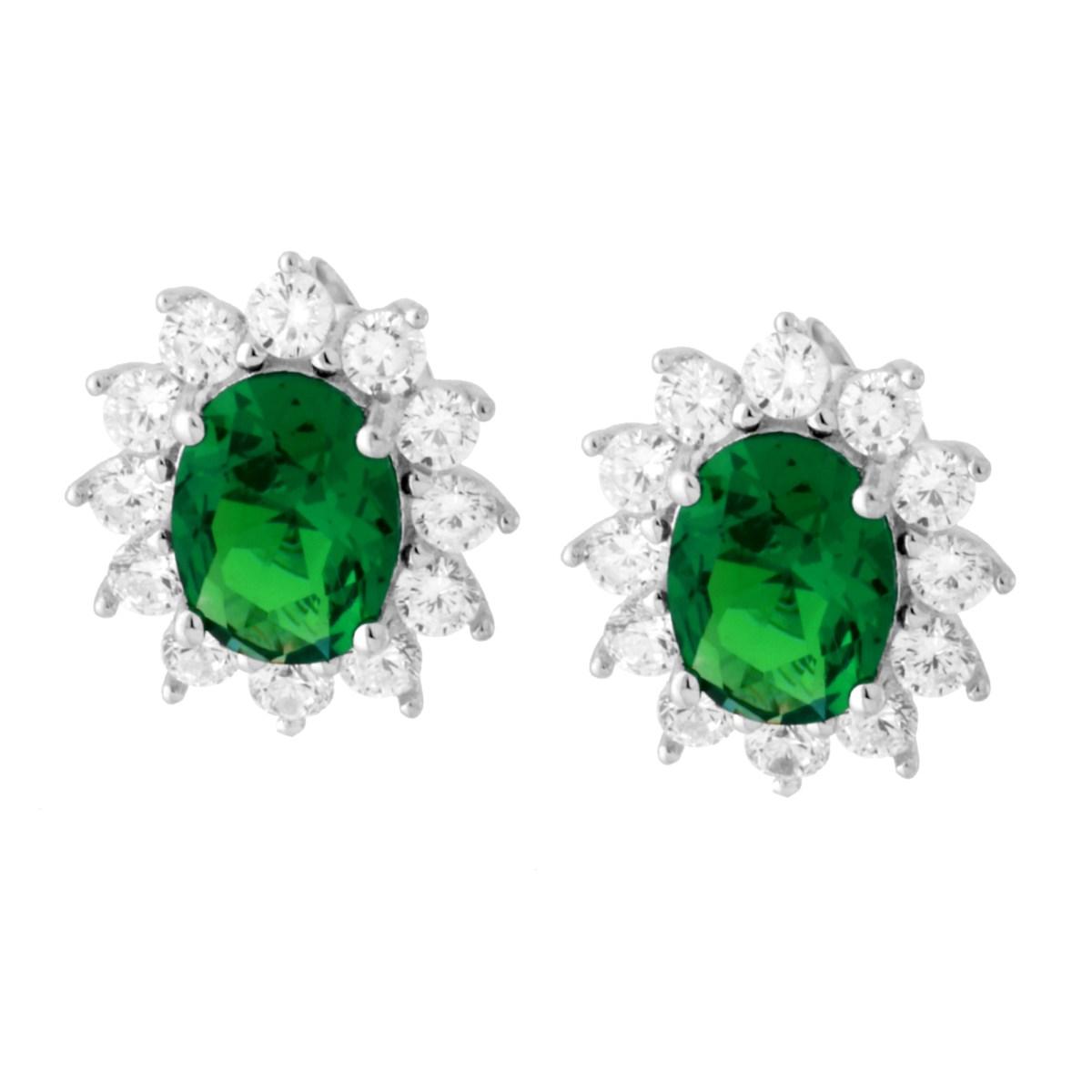 Orecchini Ovale Verde Smeraldo contornato da Cubic Zirconia Bianchi in ARGENTO 925 Galvanica Rodio
