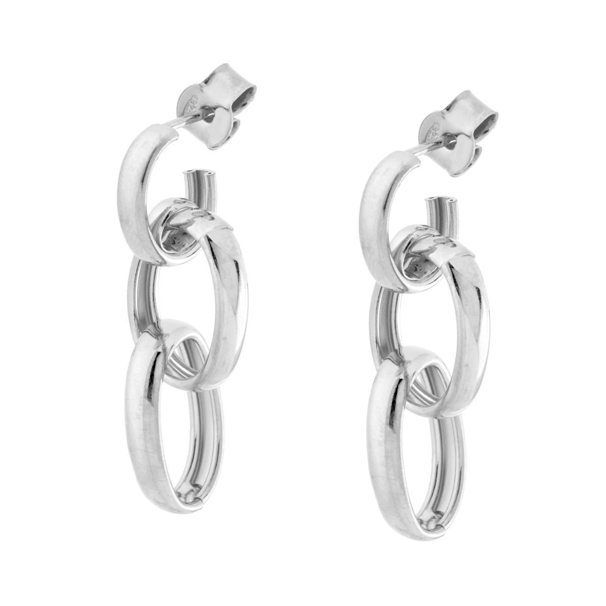 Orecchini composti da ovali pendenti con sezione piatta all'interno e bombata all'esterno, finitura liscia e lucida.