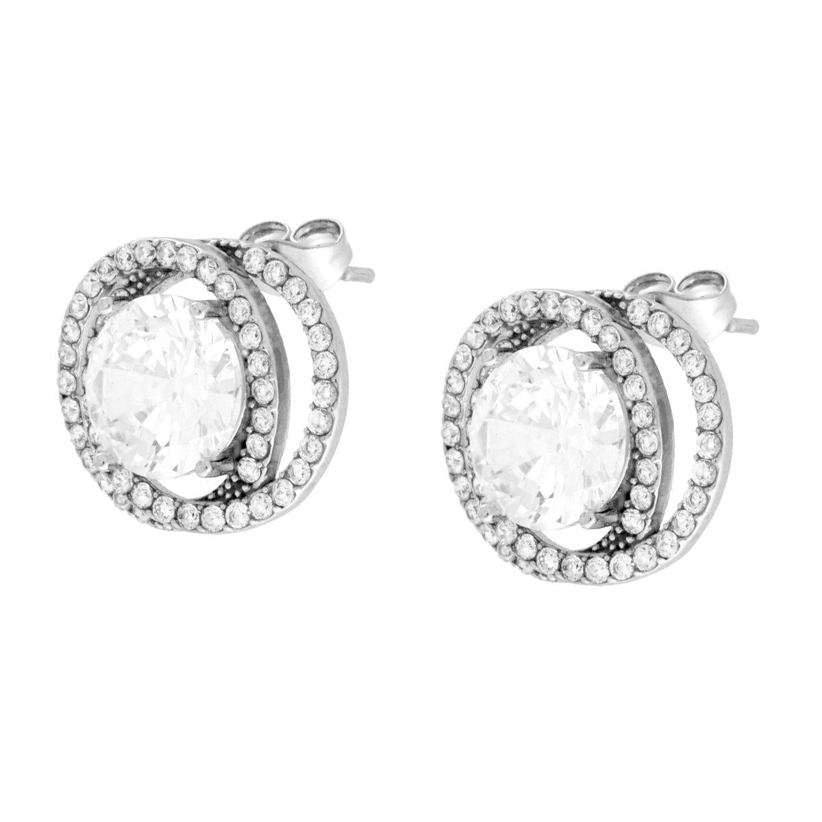 Orecchini con punto luce tondo centrale racchiuso all'interno di cerchi incrociati con crystal bianchi incastonati.