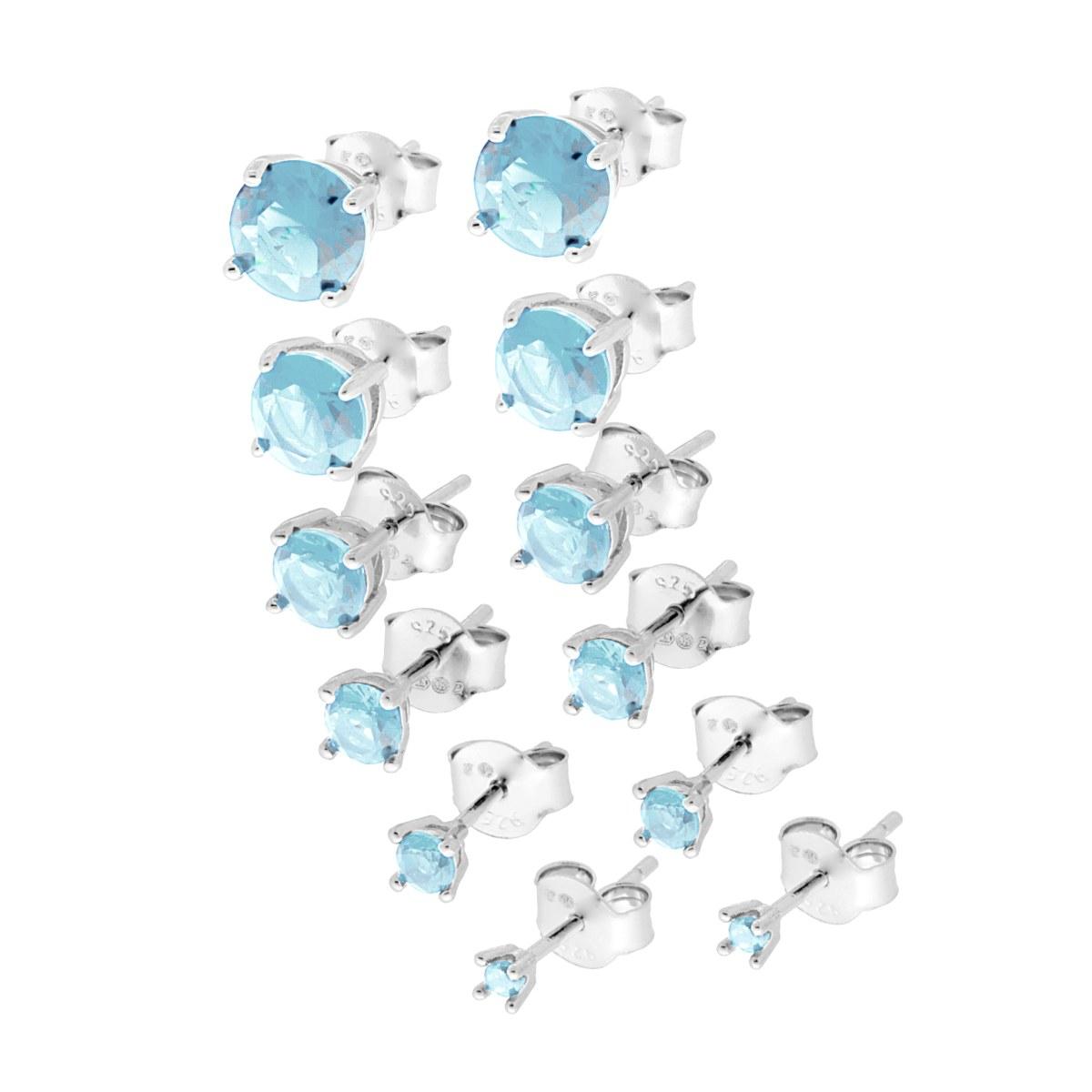 Set composto da sei paia di orecchini Punto luce in diverse dimensioni con zircone tondo acquamarina montato su 4 Griffe.