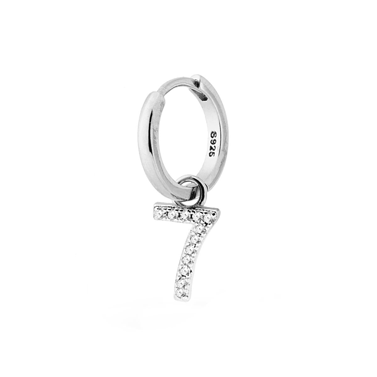Orecchino Cerchio con chiusura a scatto, con accessorio pendente Numero Sette con zirconi Bianchi incastonati.