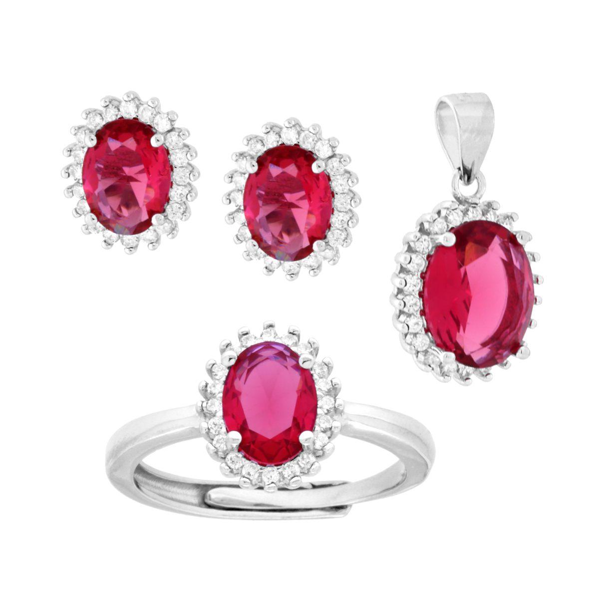 Parure Set Ciondolo Orecchini Anello Ovale Rosso Rubino contornato da Cubic Zirconia Bianchi in ARGENTO 925 Galvanica Rodio