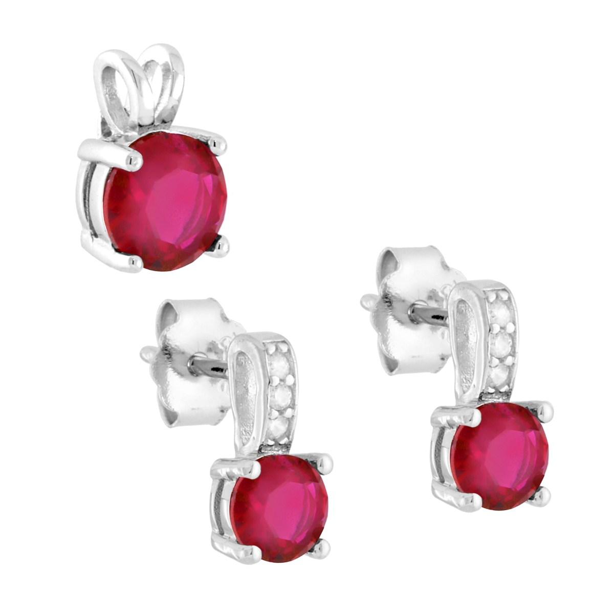 Parure Set Orecchini e Ciondolo Punto Luce Tondo Rosso Rubino con Cubic Zirconia Bianchi in ARGENTO 925 Galvanica Rodio