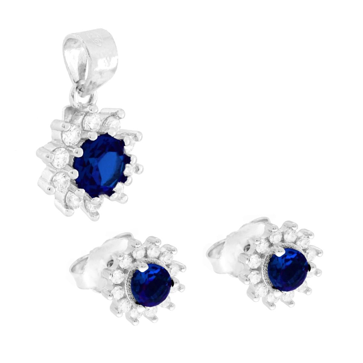 Parure Set Orecchini e Ciondolo Tondo Blu Zaffiro contornato da Cubic Zirconia Bianchi in ARGENTO 925 Galvanica Rodio