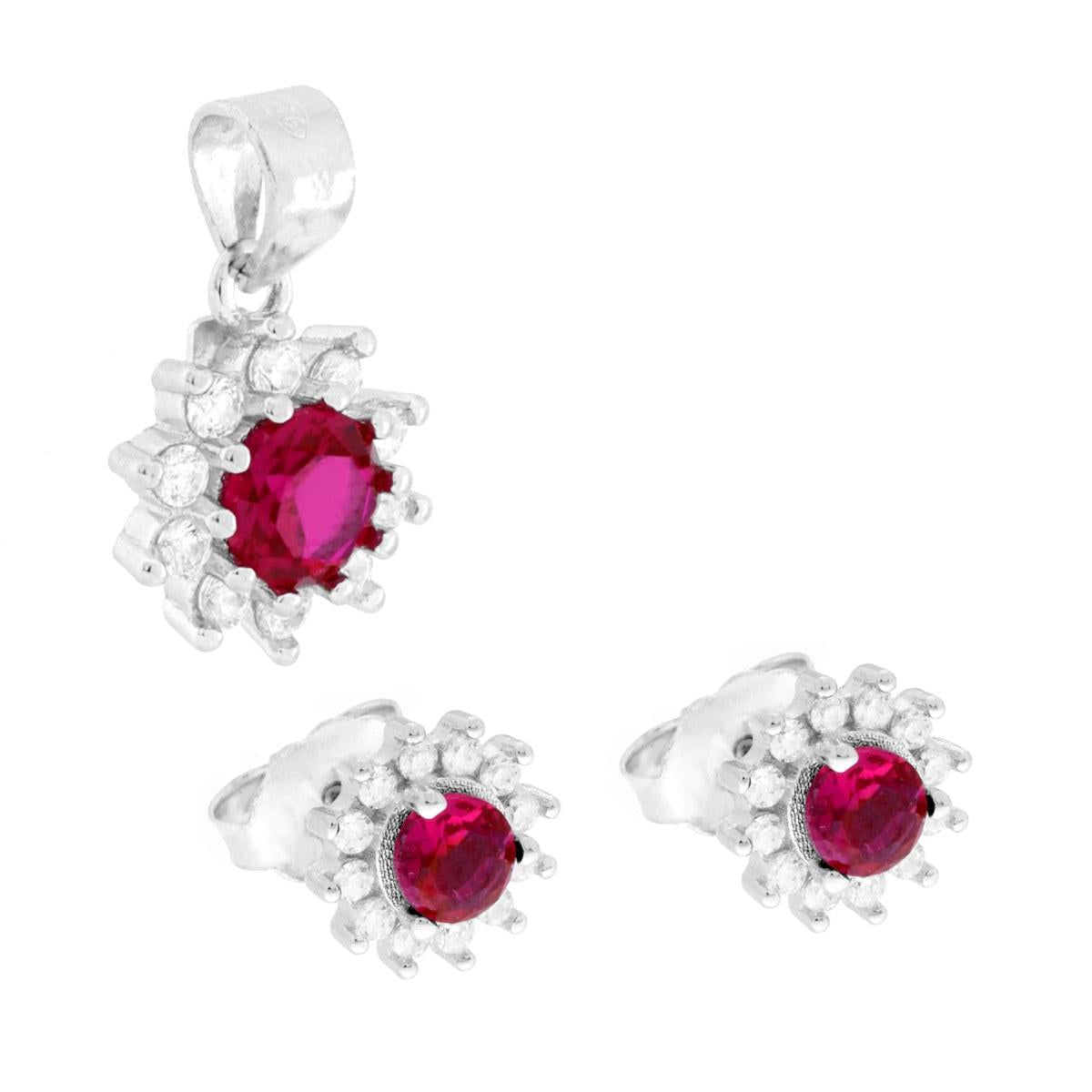 Parure Set Orecchini e Ciondolo Tondo Rosso Rubino contornato da Cubic Zirconia Bianchi in ARGENTO 925 Galvanica Rodio
